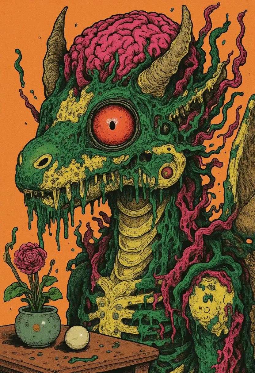 주요 학습 요소를 일부 사용하여 도움을 주어야 합니다: 노출된 분홍색 뇌, 점성이 강한 녹색 액체가 떨어지는 모습, 돌출된 붉은 눈, 젖은 녹색/노랑 표면, 보이는 골격 구조, 타버린 주황색 배경, 그리고 초현실적/생기기계적인 분위기.