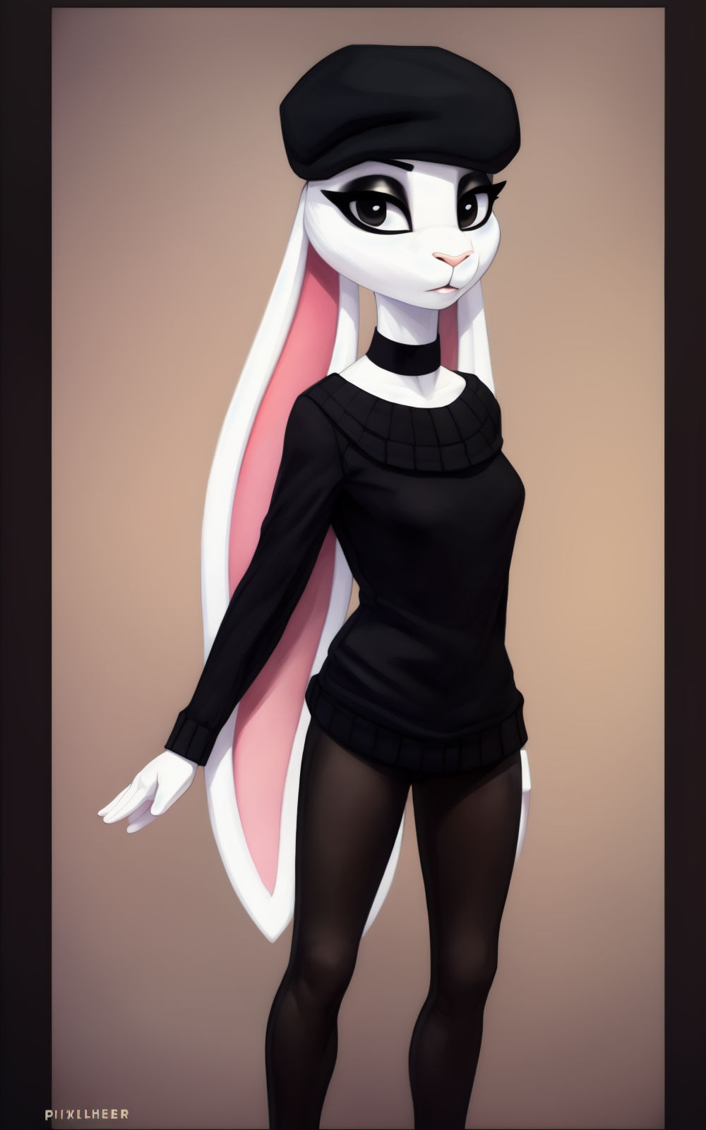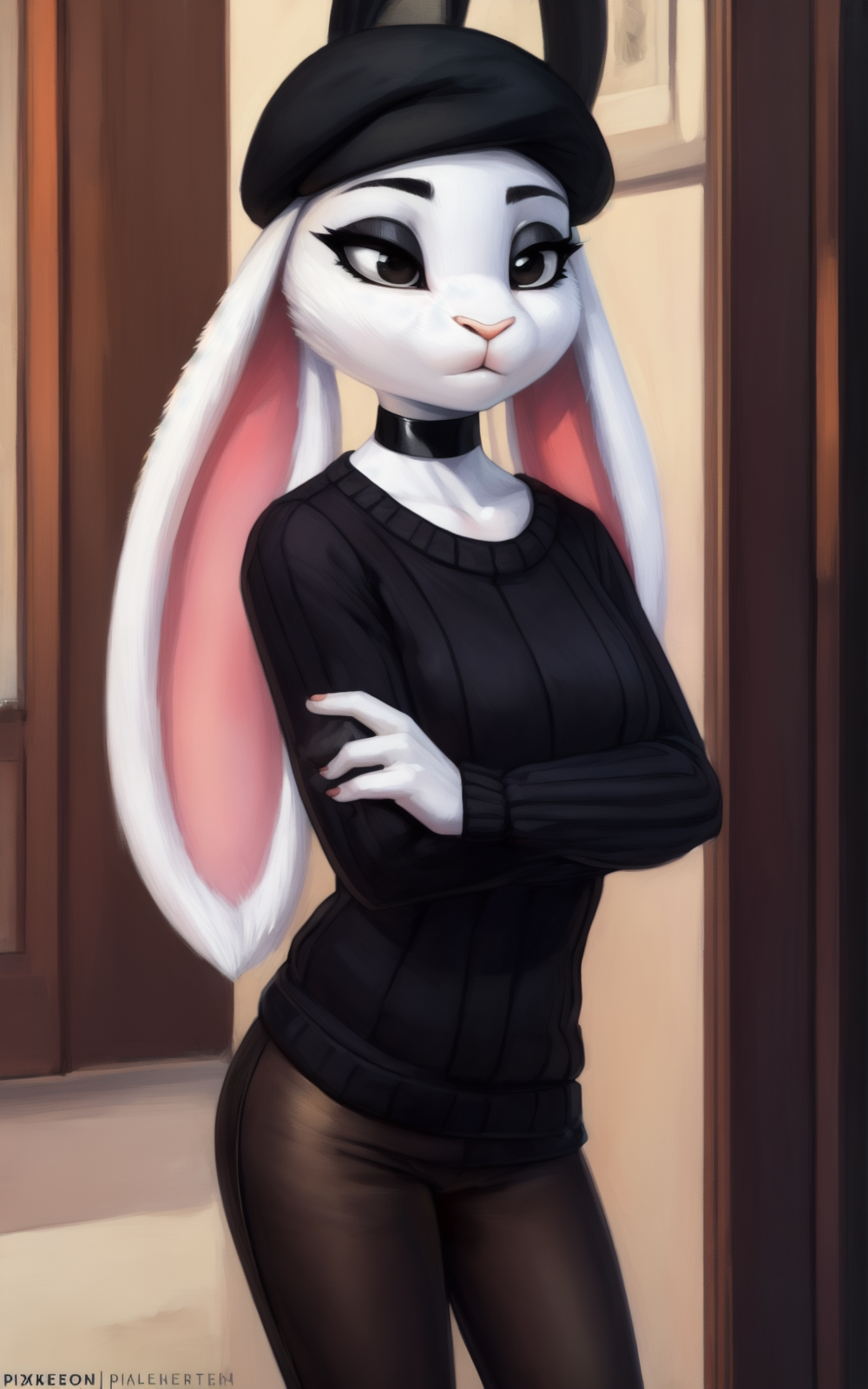 衣装:黒い頭部装具、チョーカー、レギンス、黒いレギンス、ベレー帽、セーター**