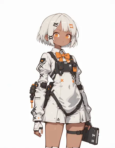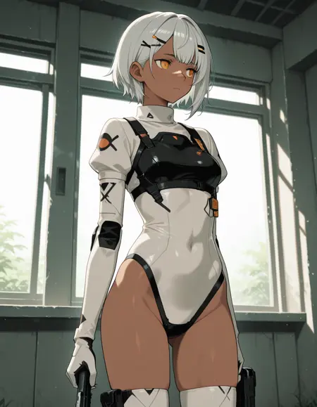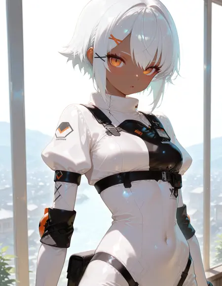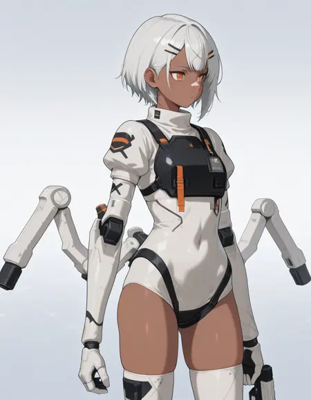 mai_pgr_sophia_yy,dark-skinned_female,freckles,android,short_hair,white_hair,orange_eyes,hairclip,white_bodysuit,white_gloves,white_thighhighs,toeless_legwear,joints,mechanical_arms