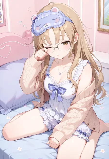 outfit4aasc, long hair, light brown hair, mask on head, sleep mask, glasses, brown eyes, necklace, pajamas, white camisole, brown cardigan, long sleeves, sleeves past wrists, blue bow, white bloomers