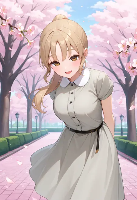 outfit2aasc, long hair, light brown hair, ponytail, brown eyes, collared dress, grey dress, short sleeves, buttons, black belt