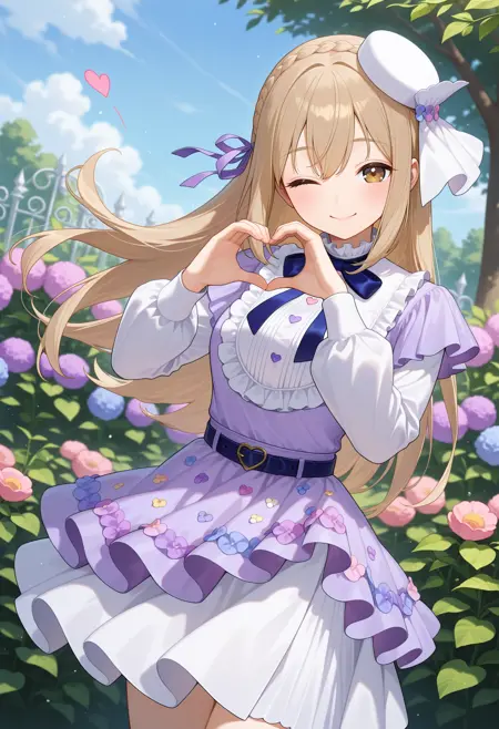 outfit6ccsc, long hair, light brown hair, braid, mini hat, white headwear, hair ribbon, hair between eyes, brown eyes, blue bowtie, frills, purple dress, long sleeves, white sleeves, belt, white skirt