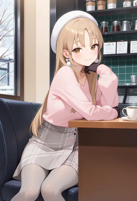 outfit3aasc, long hair, light brown hair, beret, white headwear, earrings, brown eyes, pink sweater, long sleeves, black gloves, plaid skirt, grey skirt, grey pantyhose