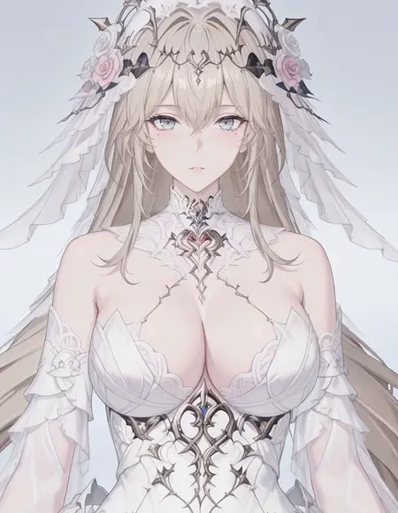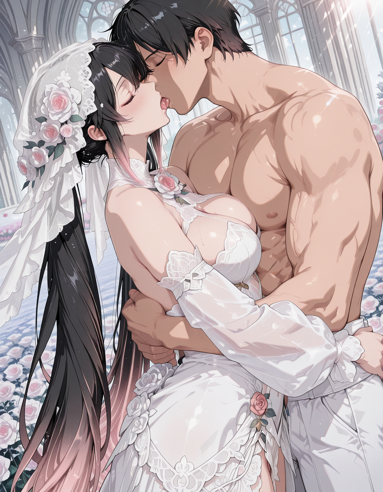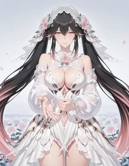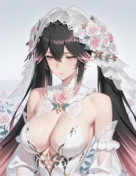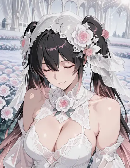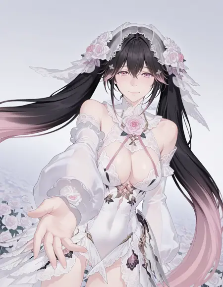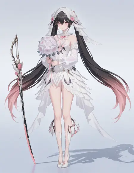 mai_prg_lucia_fxcs,mature female,(aged up:1.5),skinny,hair_between_eyes,very_long_hair,twintails,black_hair,pink_hair,multicolored_hair,gradient_hair,hair_ornament,hair_flower,rose,white_flower,pink_rose,pink_eyes,white_dress,wedding_dress,bare_shoulders,bridal_veil,detached_sleeves,high_heels,holding_bouquet,planted_sword