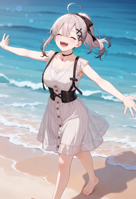 outfit5-2eekana, long hair, grey hair, ponytail, hair bow, ahoge, x hair ornament, mole under eye, black choker, casual, see-through dress, white dress, sleeveless, suspenders, black corset