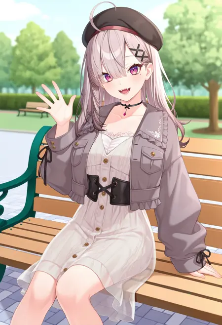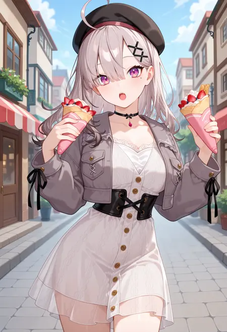 outfit5-1eekana, long hair, grey hair, ahoge, beret, black headwear, x hair ornament, mole under eye, black choker, casual, see-through dress, white dress, cropped jacket, grey jacket, long sleeves, black corset