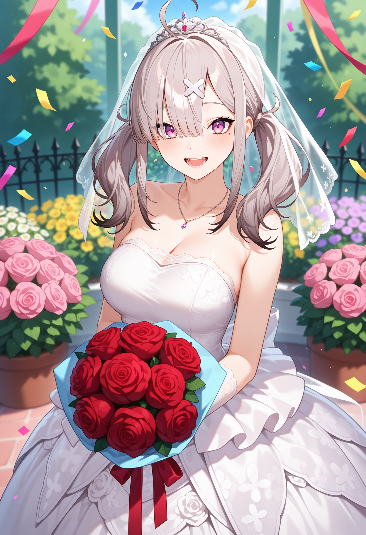 outfit1aakana, long hair, grey hair, twintails, ahoge, nurse cap, white headwear, x hair ornament, mole under eye, white dress, short sleeves, bandaged arm, white gloves, white apron