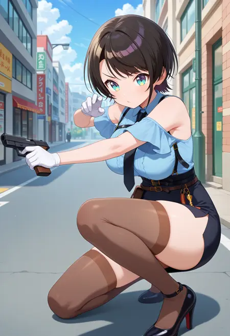 outfit9-2iisubaru, short hair, black hair, bare shoulders, shoulder cutout, black necktie, harness, suspenders, blue shirt, white gloves, belt, taut skirt, black skirt, brown thighhighs