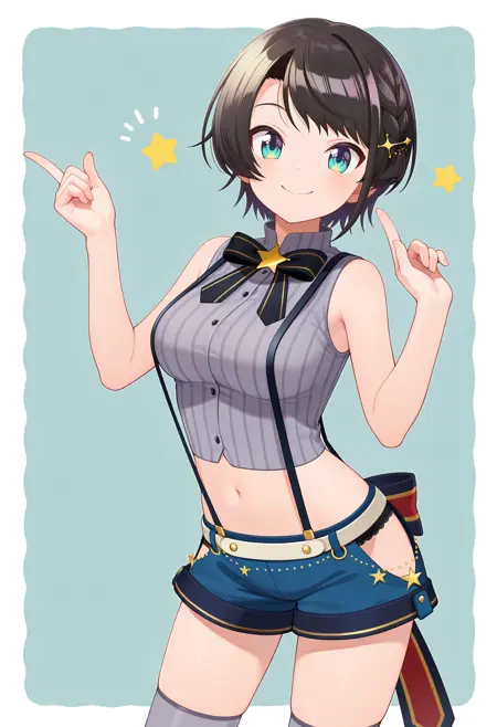 outfit2-2bbsubaru, short hair, black hair, french braid, hair ornament, black bowtie, suspenders, crop top, pinstripe shirt, grey shirt, sleeveless, midriff, blue shorts, hip vent, grey thighhighs