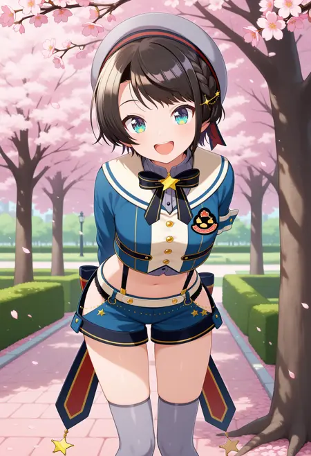 outfit2-1bbsubaru, short hair, black hair, french braid, grey headwear, beret, hair ornament, sailor collar, black bowtie, suspenders, crop top, cropped jacket, blue jacket, long sleeves, midriff, blue shorts, hip vent, grey thighhighs