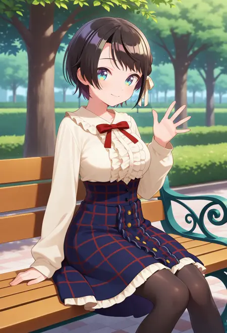 outfit6-2ffsubaru, short hair, black hair, hair ribbon, red bowtie, center frills, frilled shirt, white shirt, long sleeves, high-waist skirt, plaid skirt, blue skirt, black pantyhose
