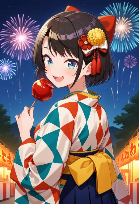 outfit4ddsubaru, short hair, black hair, hair bow, kanzashi, tassel hair ornament, print kimono, multicolored kimono, long sleeves, wide sleeves, sash, hakama skirt, blue skirt