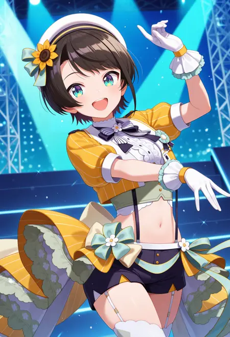 outfit7ggsubaru, short hair, black hair, beret, white headwear, hat flower, bowtie, cropped jacket, yellow jacket, short sleeves, white gloves, suspenders, midriff, short shorts, black shorts, yellow skirt, garter straps, white thighhighs