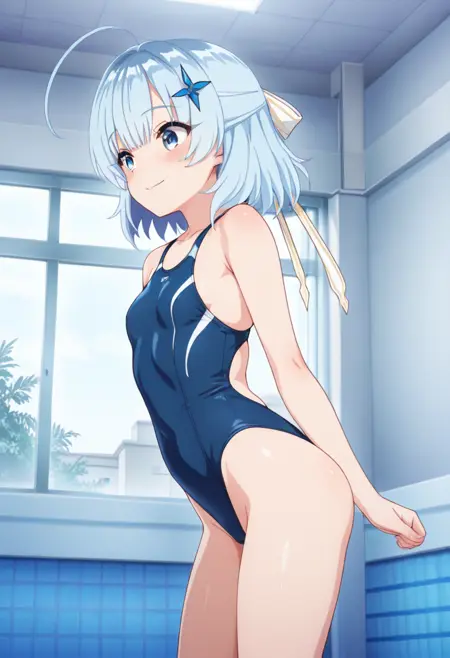 1girl, blue eyes, ahoge, hair ornament, small breasts, ribbon, blue hair,