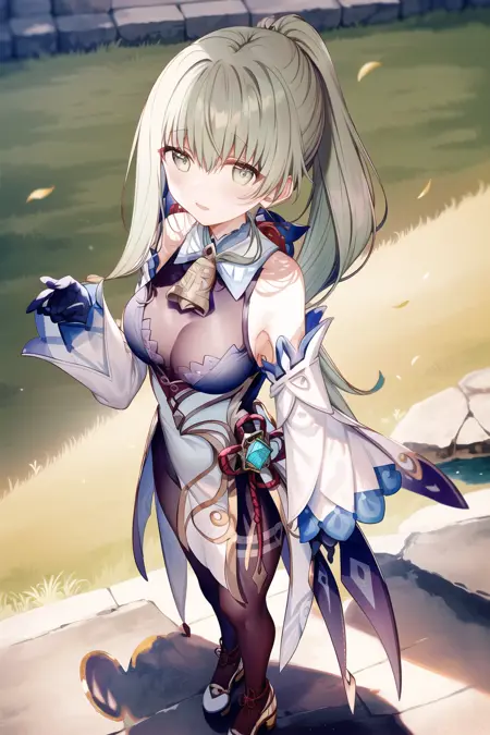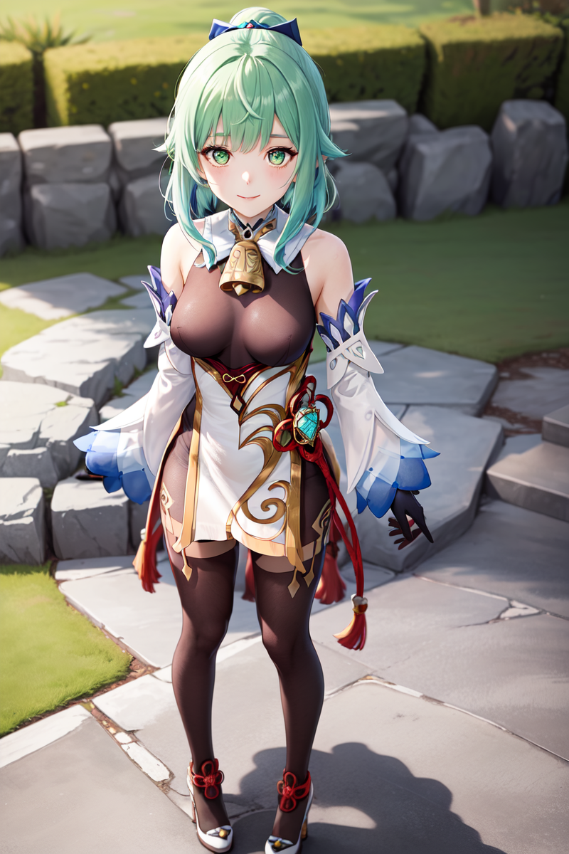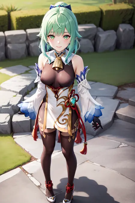 트리거 단어: 1girl, solo, genshin impact, detached sleeves, white footwear, high heels, black gloves, bodystocking, neck bell, chinese knot