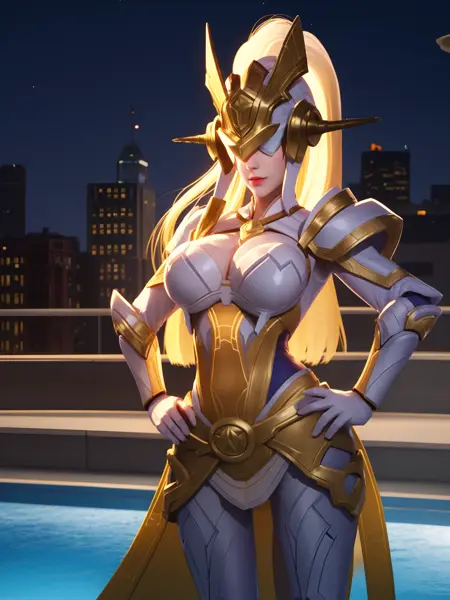 - WZRYnvwaYP,1girl,solo,armor,ponytail,breastplate,helmet,long hair,breasts,shoulder armor,blonde hair,lips,belt,cityscape,night,mature female,pool,covered eyes, hand on hip, gloves,