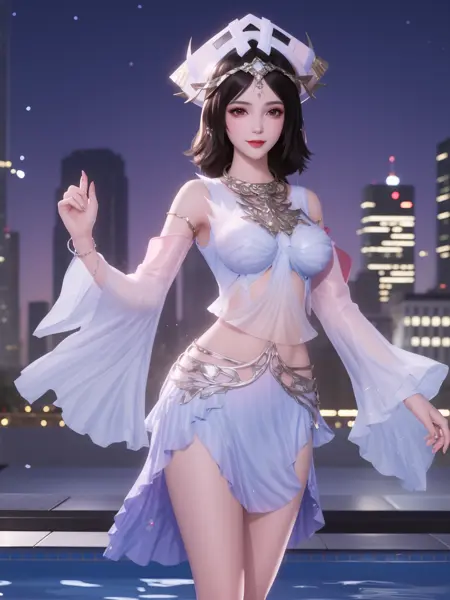 - WZRYyaoZMCLY, 1girl, solo, black hair, jewelry, midriff, black eyes, hat, lips, detached sleeves, necklace, looking at viewer, dress, clothing cutout, wide sleeves, cityscape, night, mature female, pool, hand on hip, light smile, makeup,
