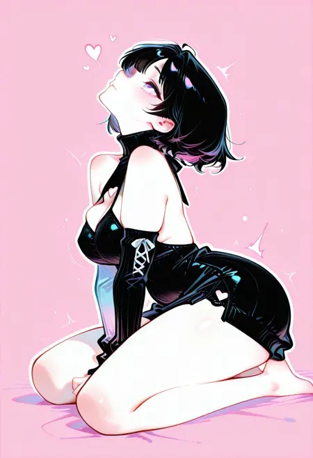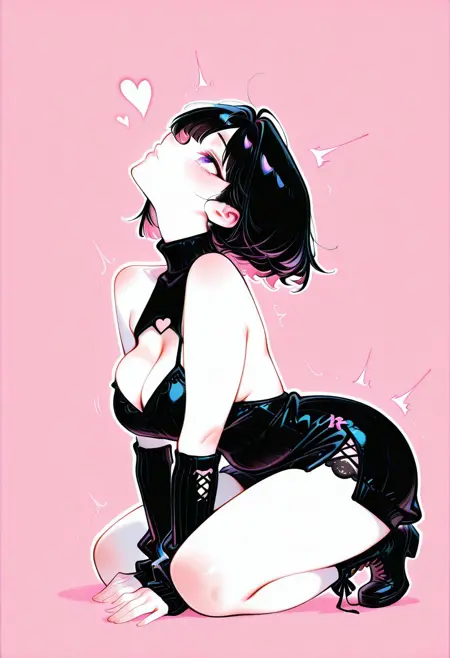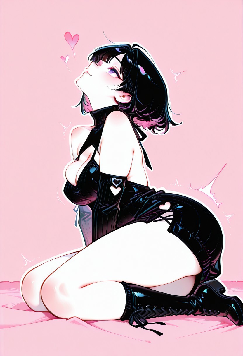 1girl, tomboy, 20 y/o, short hair, thick eyebrows, medium soft breasts, slim, smile, lavender eyes, slim waist, wide hips ,Dark Pink Asymmetrical pixie cut, hair covering left eye, undercut,