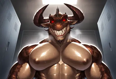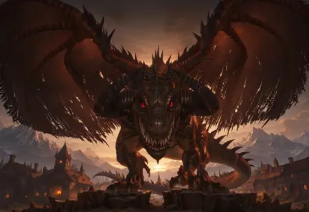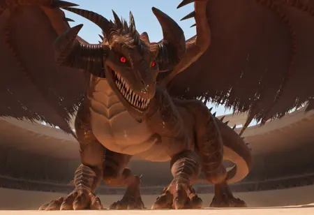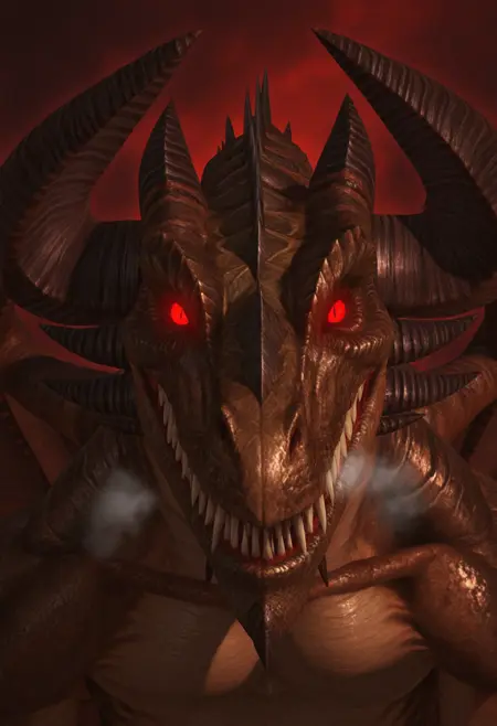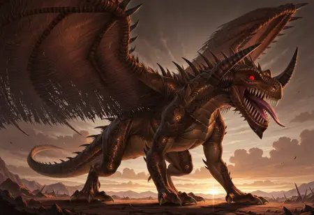 태그: 야수적, 검은갈색 비늘, 찢긴 날개, 드래곤, 인간 없음, 괴물, 발톱, 날카로운 이빨, 붉은 눈, 빛나는 눈, 뿔
