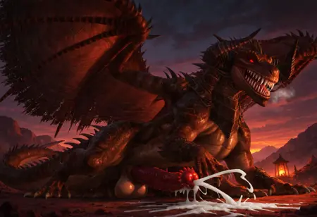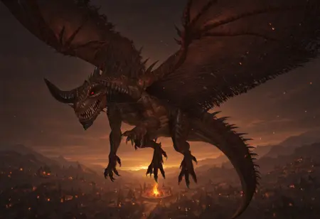 标签:野性、深棕色鳞片、破损的翅膀、龙、无人类、怪物、爪子、尖牙、红眼睛、发光眼睛、角
