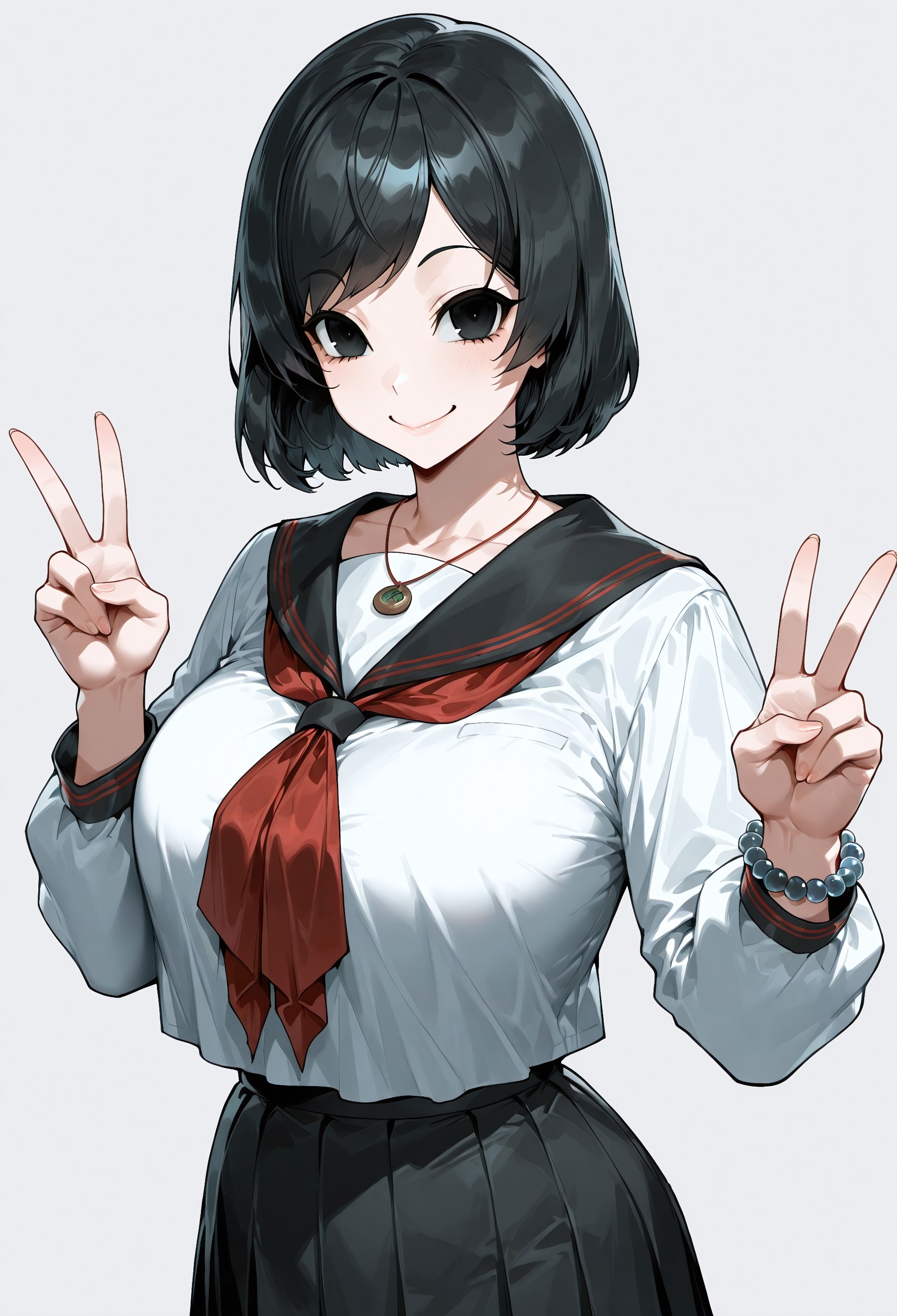 sch00l_m0e, 1girl, solo, 黒髪, 短髪,ボブカット, 流れ眉, 黒目, 大きな胸, 学校制服, セーラー服, 白シャツ, セーラー襟, 長袖, 赤いネクタイ, ジュエリー, ネックレス, ビーズ, ビーズブレスレット, 黒スカート, プリーツスカート