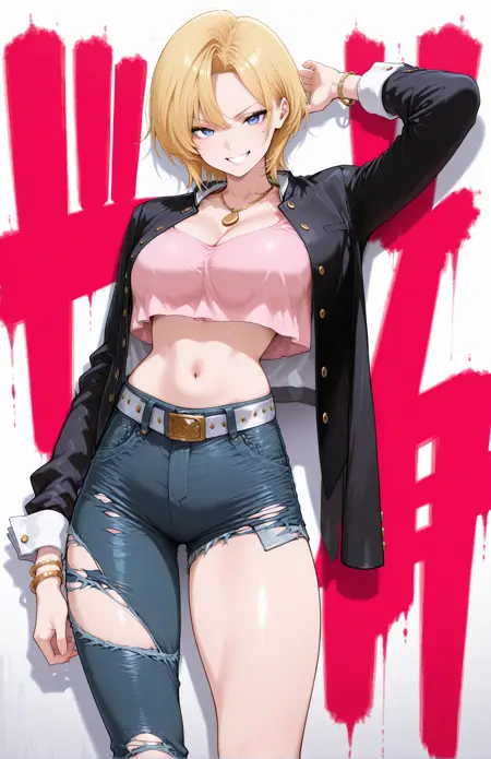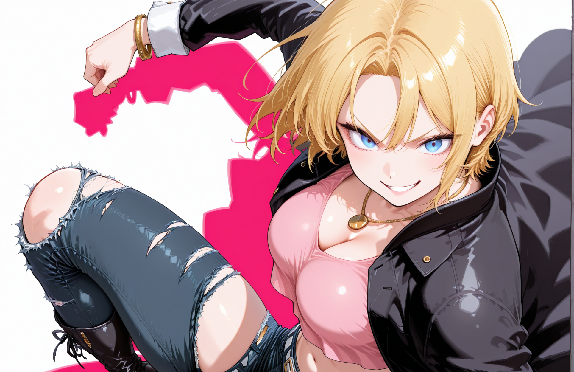 トリガー単語: nagi_h, 1girl, ブロンドの髪, 黒いブーツ, ブレスレット, 黒いジャケット, 短い髪, 破れたレギンス, 破れたパンツ, ジーンズショートパンツ, パンツの上に見えたクロップトップ, ピンクのクロップトップ, 白いベルト, 分け目のある髪, キニーハイブーツ, ボブカット, 金のネックレス, 学ラン, 白い手首のカフス, V字型の眉, 青い目