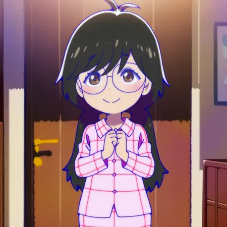 nozomi, 1girl, glasses, antenna hair, long hair, smile, pink pajamas, brown eyes,