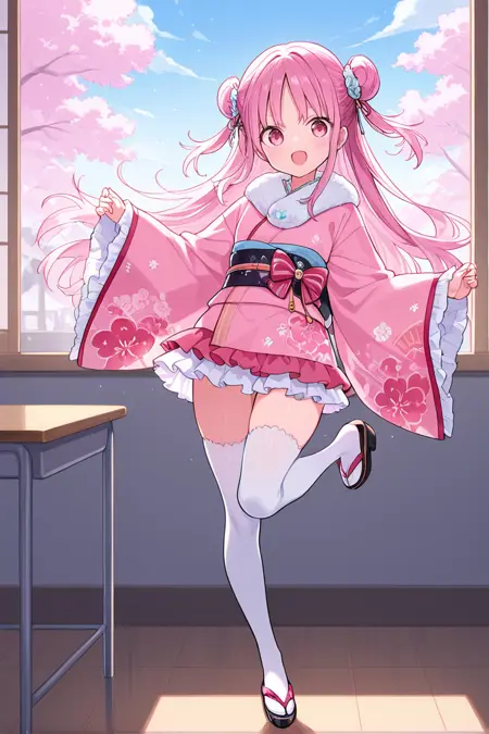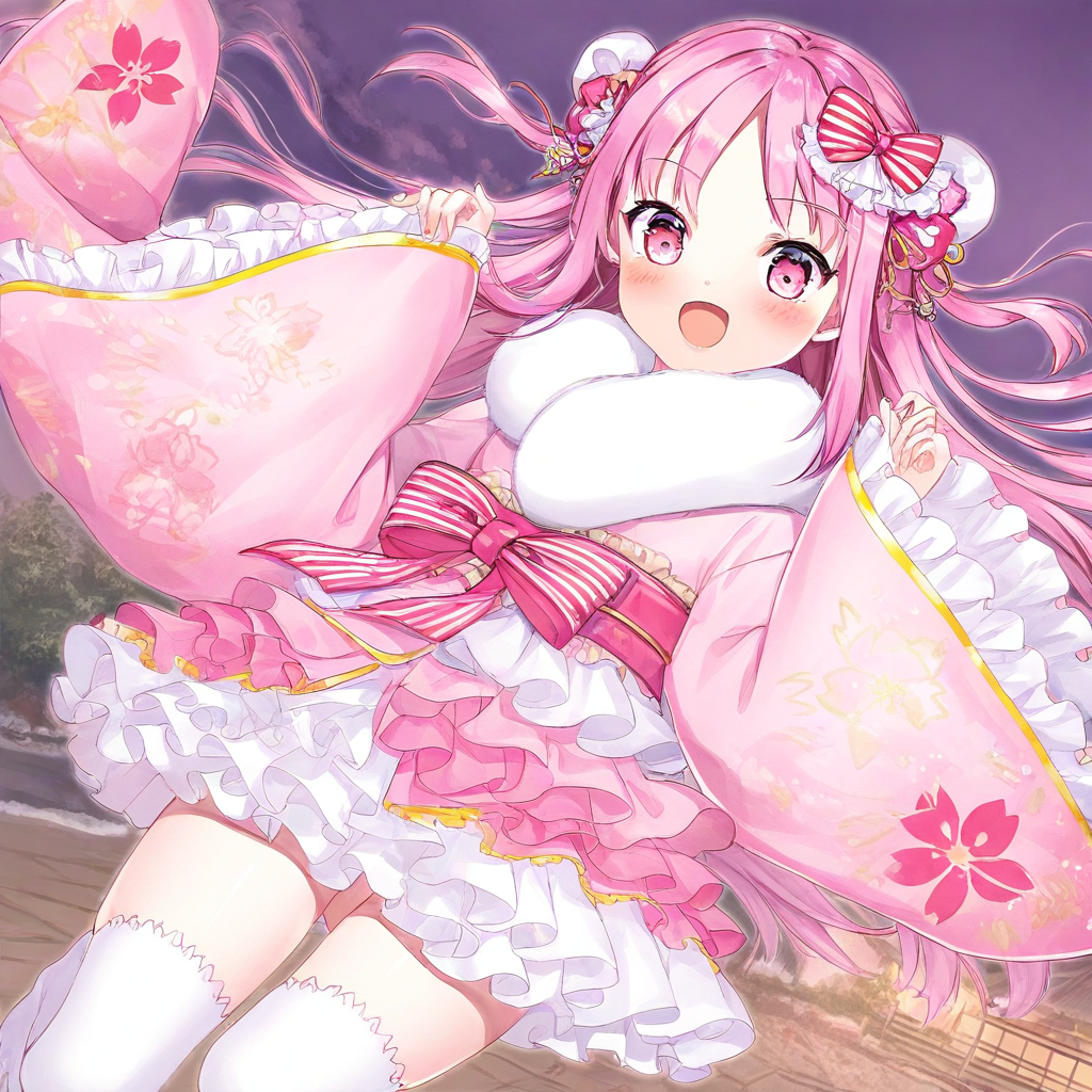 tama_yukata, 더블 단추, 머리 단추, 일본식 옷, 긴 소매, 오비, 띠, 허벅지 곧은 양말, 꽃무늬 프린트, 긴 소매, 프릴이 달린 소매, 프릴, 털 장식이 있는 기모노, 분홍색 기모노, 양쪽 올려묶기, 줄무늬 리본, 흰색 털, 넓은 소매, 유카타, 흰색 허벅지 곧은 양말,