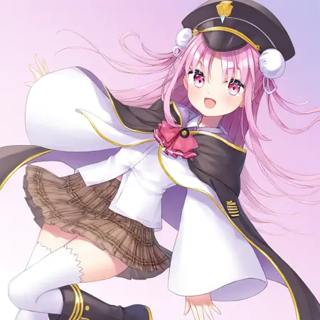 tama_normal, 양쪽 올려묶기, 더블 단추, 눈 사이의 머리카락, 곧은 머리, 검은 부츠, 검은 망토, 검은 모자, 붉은 리본, 갈색 스커트, 머리 단추, 군용 모자, 미니스커트, 체크무늬 스커트, 주름스커트, 흰색 캐프, 흰색 허벅지 곧은 양말, 젯타이 리ョ우키, 넓은 소매, 긴 소매,