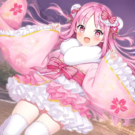 tama_yukata,双发髻,发髻,日本服装,长袖,腰带,束带,过膝袜,花卉图案,长袖,荷叶边袖子,荷叶边,毛皮镶边和服,粉色和服,两侧高髻,条纹蝴蝶结,白色毛皮,宽袖,浴衣,白色过膝袜,