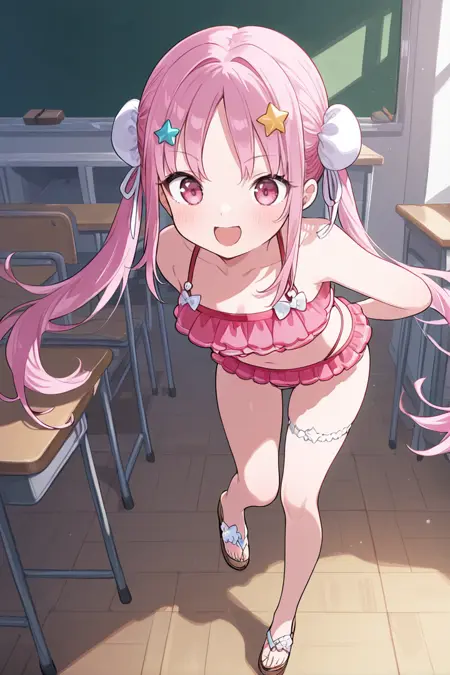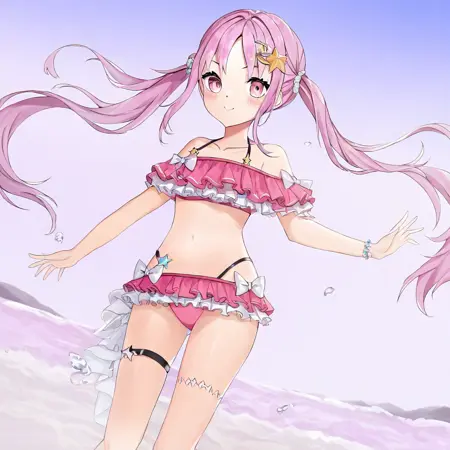 tama_swiming, 프릴이 달린 비키니, 프릴, 트윈테일, 수영복, 허벅지 스트랩, 갈라진 앞머리, 분홍색 비키니, 별 모양 머리 장식,