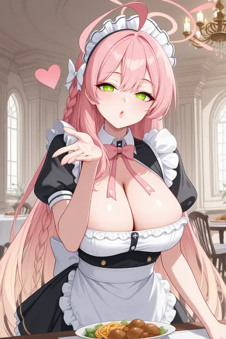 외모: h4nak0, 큰 가슴, 분홍색 환상, 초록색 눈, 밝은 동공, 그라데이션 머리카락, 분홍색 머리카락, 중간 갈라진 앞머리, 눈 사이의 머리카락, 아호게, 매우 긴 머리카락, 옆 머리 땋기, 머리카락 리본, 흰색 리본