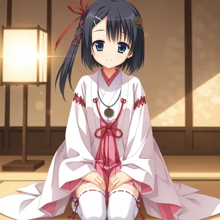 one side up,side ponytail,tassel hair ornament,hair ribbon,red ribbon,miko,white kimono,japanese clothes,wide sleeves,white thighhighs,long sleeves,pink skirt,pleated skirt,hakama short skirt,ribbon-trimmed sleeves,ribbon-trimmed thighhighs,two-sided fabric,pink lining,pink sash,layered kimono,necklace,
