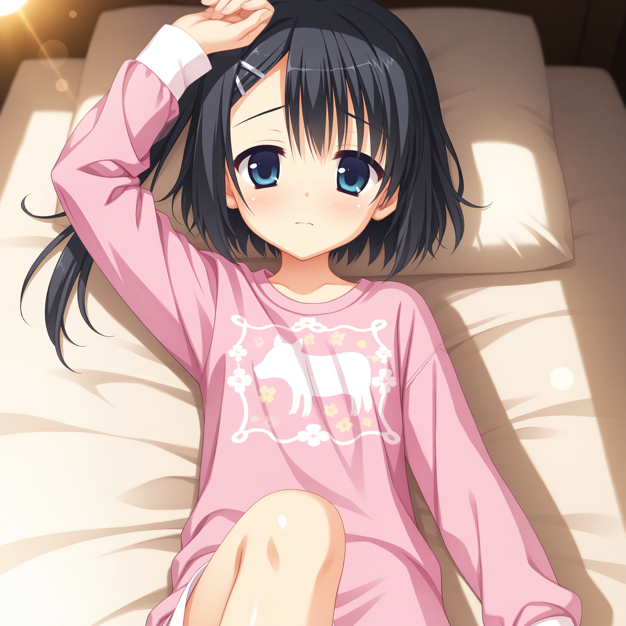 one side up,side ponytail,pink pajamas,pink shirt,long sleeves,print shirt,white sleeve cuffs,