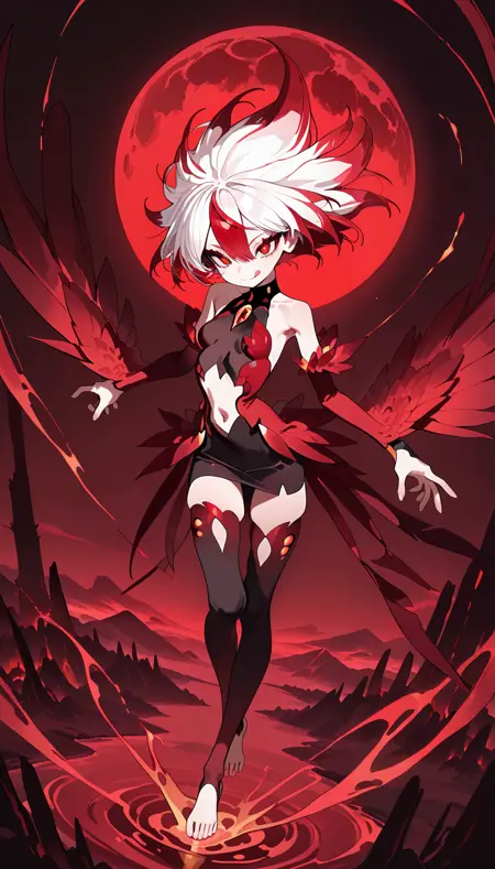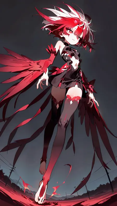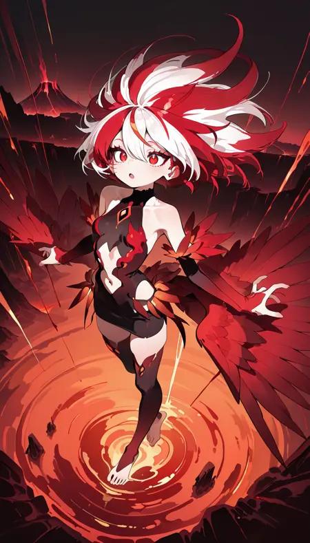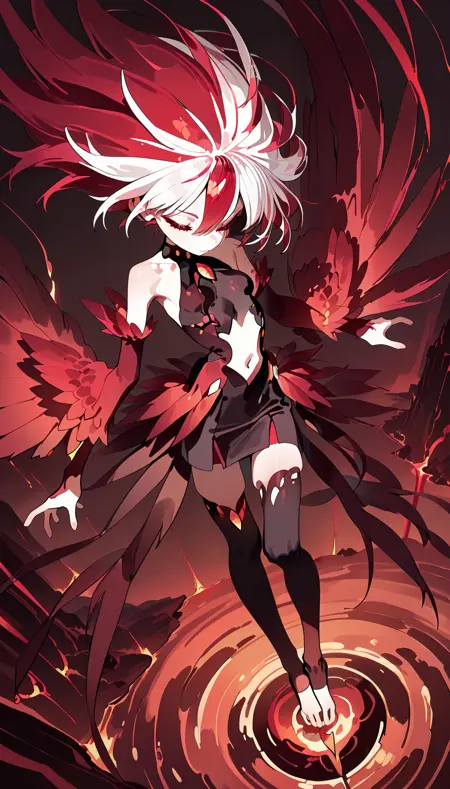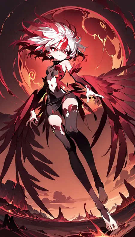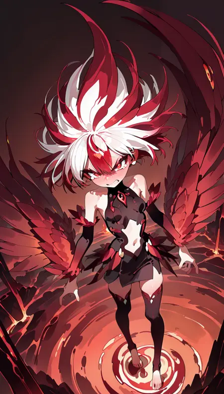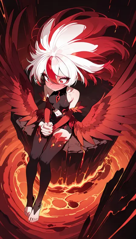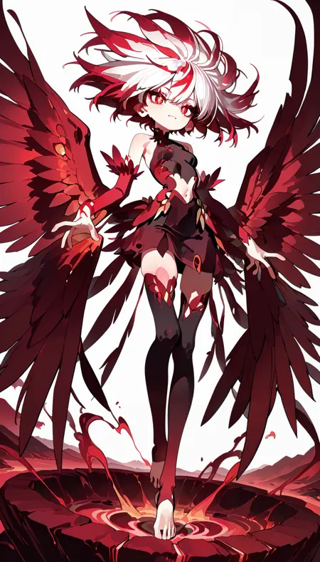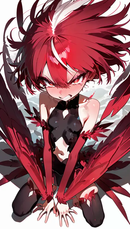 two-tone hair,white hair,red wings,bare shoulders,feathered wings,small breasts,