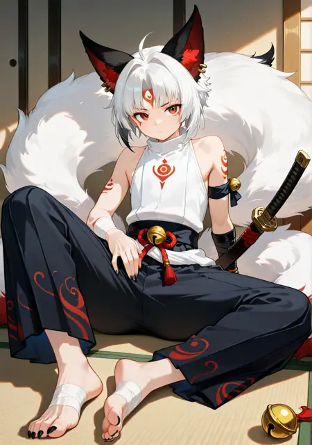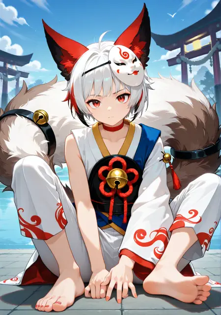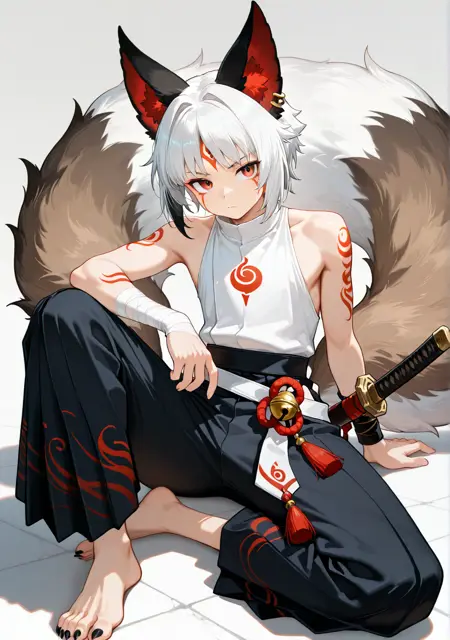 | 训练词汇 | hakuzousu, animal_ears, fox_ears, red_eyes, fox_boy, unevolved, white_hair, two_tails, red_nails, mask_on_head, nail polish, single sleeve, barefoot, jingle bell, red_choker, short hair, tail ornament, streaked hair, body fur 已复制! evolved, white_hair, two_tails, black nails, facial mark, katana, hakama, jewelry, black pants, forehead mark, bell, tattoo, earrings, bandages, sharp toenails, tassel, sleeveless, sheathed, claws, french braid, fox_mask 已复制! |