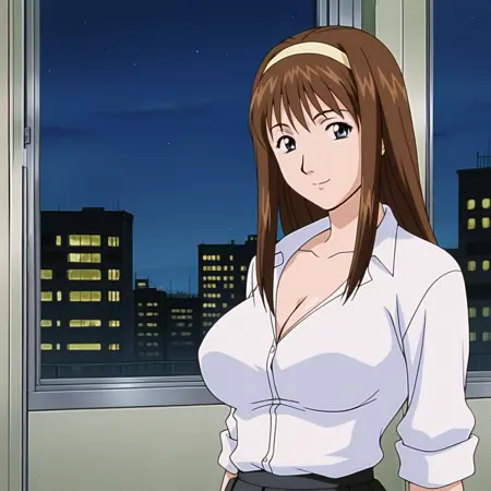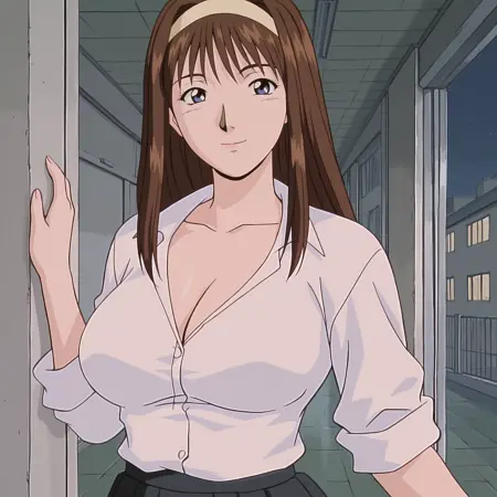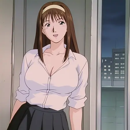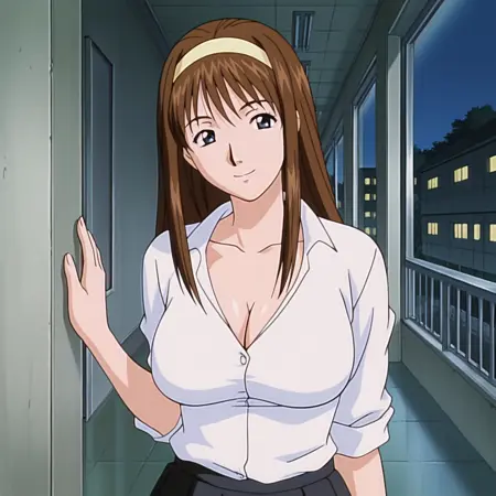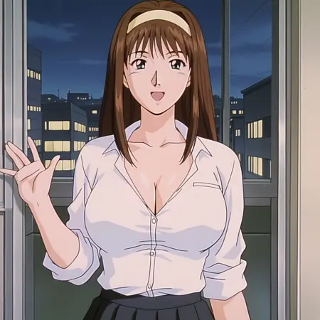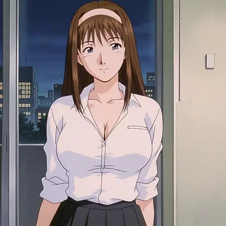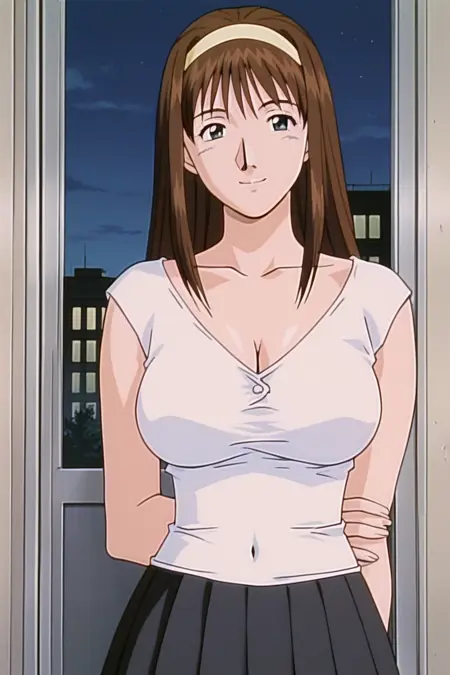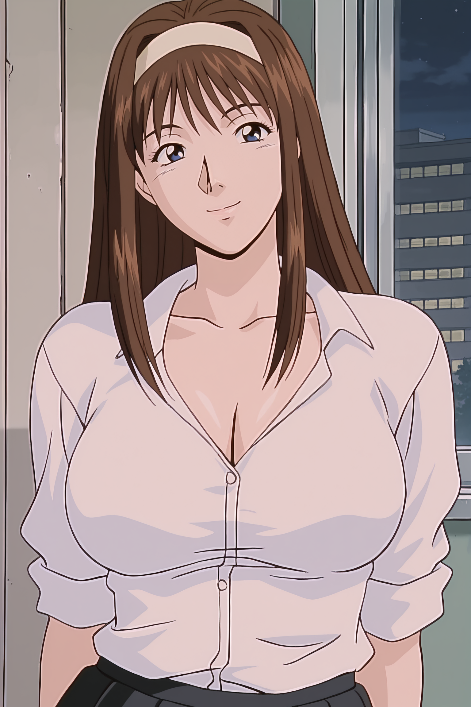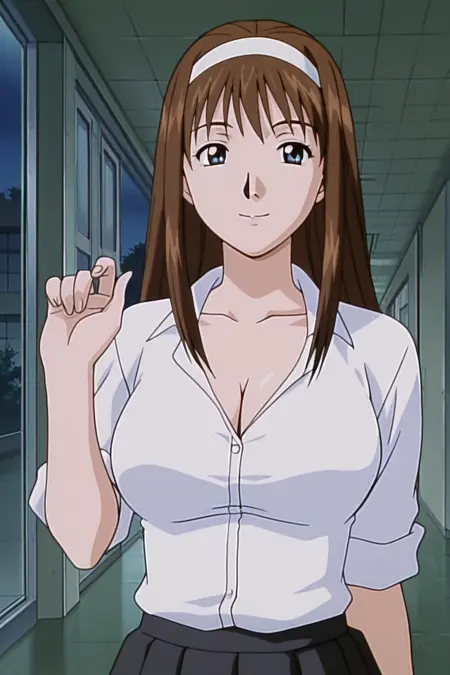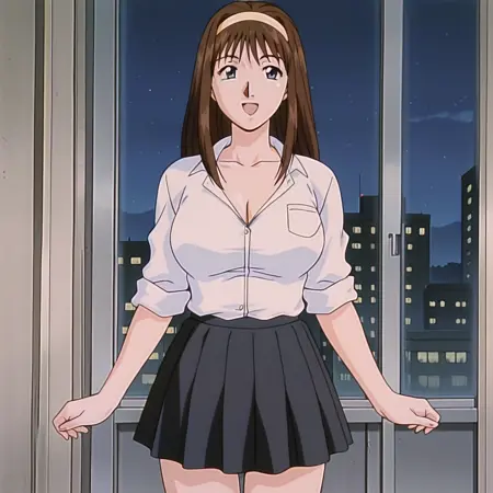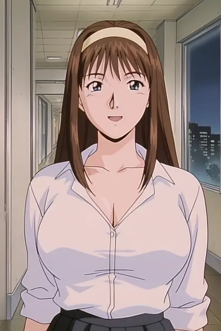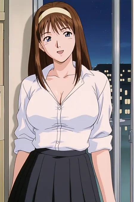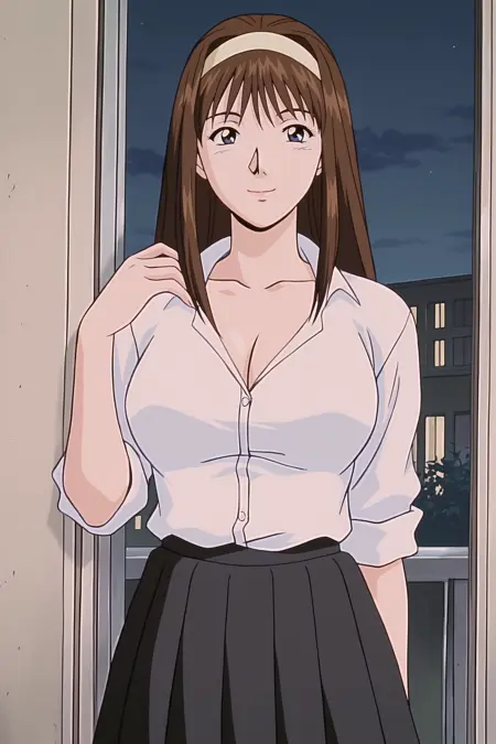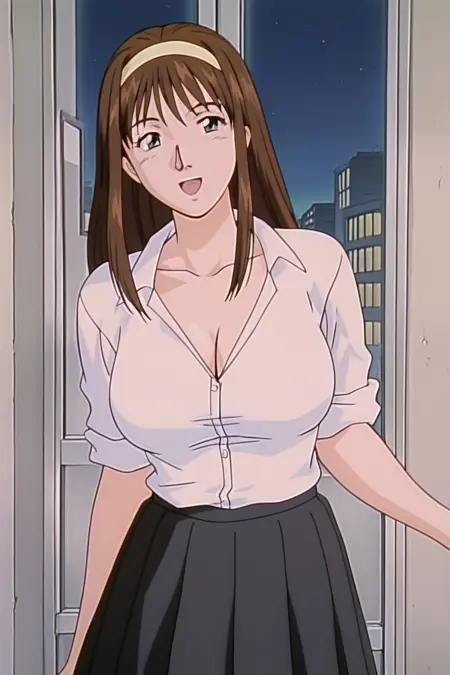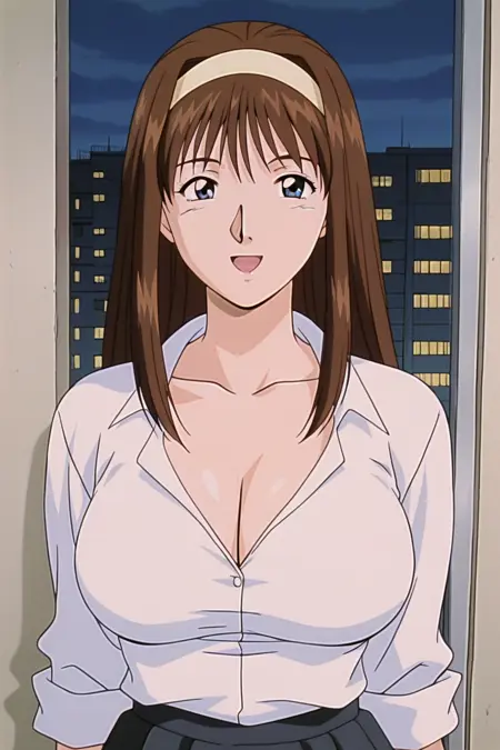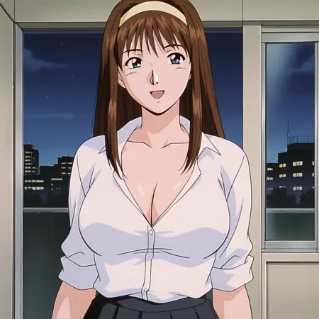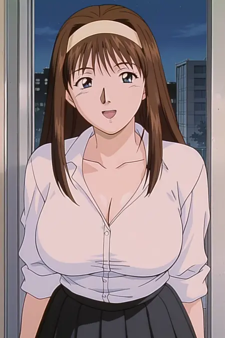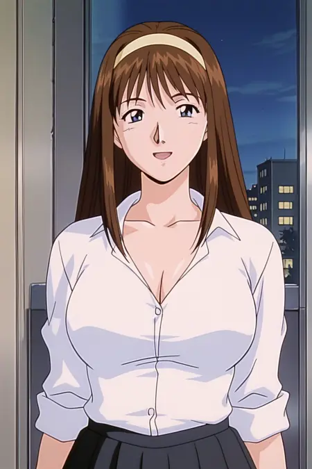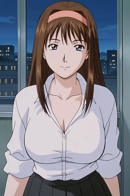 gto_style, gto_for_tomoko_nomura, 1990s \(style\), retro artstyle, blue eyes, brown hair, long hair, large breasts,collarbone, covered navel, cleavage, smile, hairband, white shirt, black pleated skirt