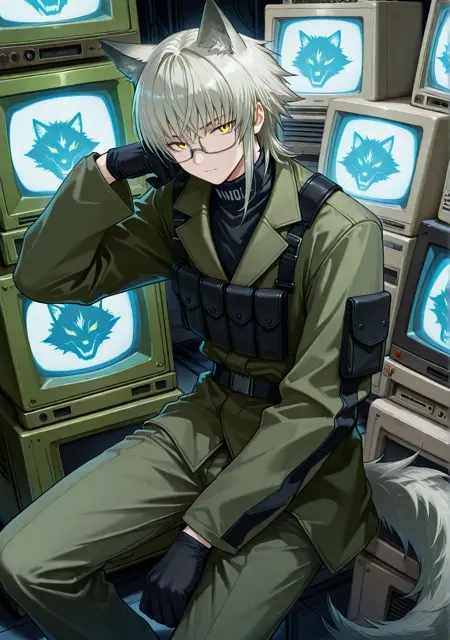 | Trained Words | aosta, grey hair, yellow eyes, wolf ears, default, wolf boy, wolf tail, red gloves, hood, coat, blue coat, black pants,necklace, hooded jacket, jewelry, white_shirt, bandaid_on_nose,Copied! skin1, pants, glasses, black gloves, green pants, crt, green jacket,Copied! |