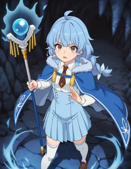 alternate hairstyle, adventurer outfit 2, fur-trimmed blue cape, tassel, white collared shirt, brown necktie, blue suspender skirt, long sleeves, white thighhighs, brown loafers