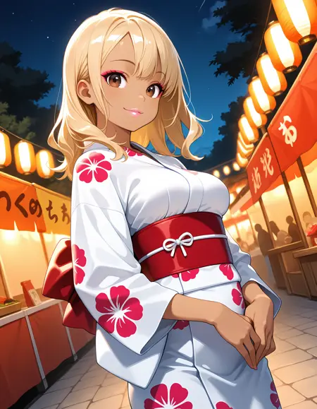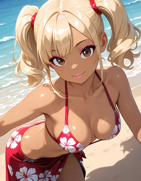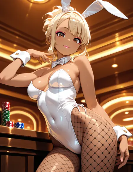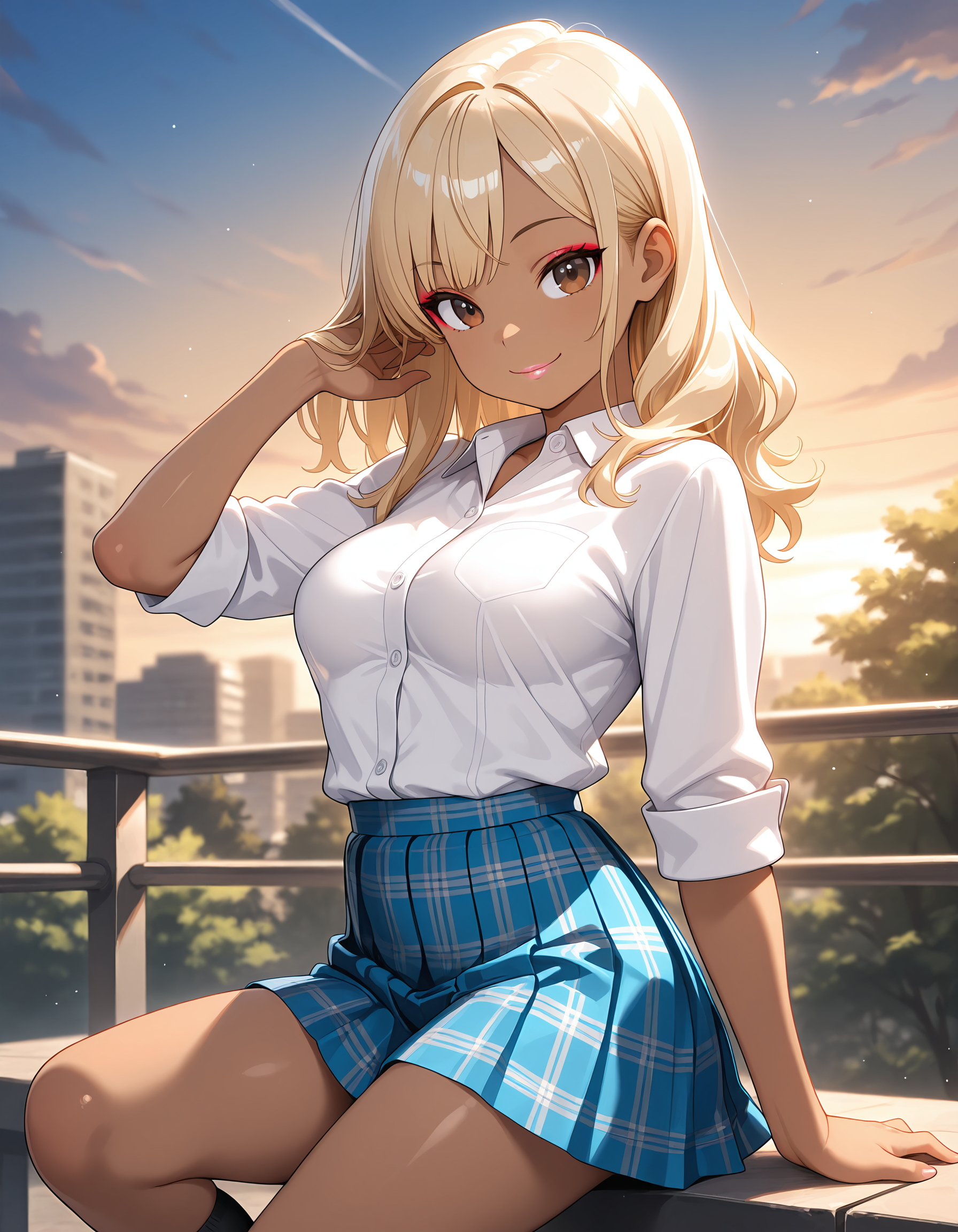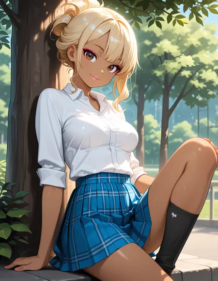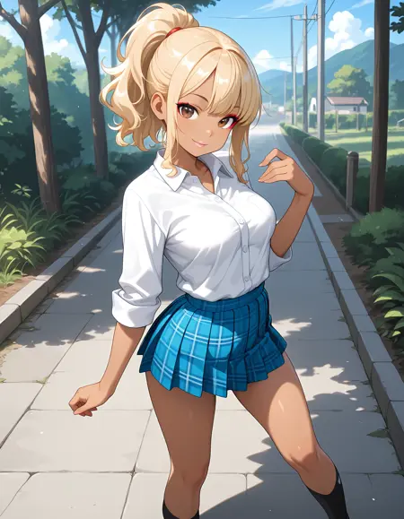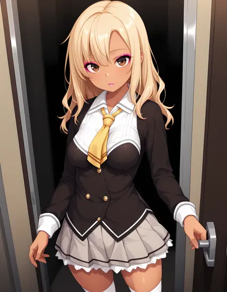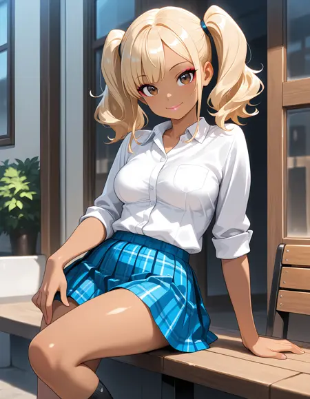 JK-gal, blonde hair, dark skin, medium breasts, makeup, lips,