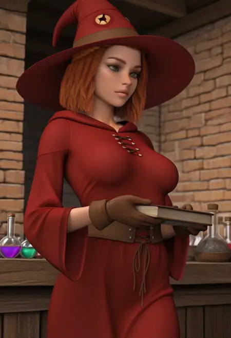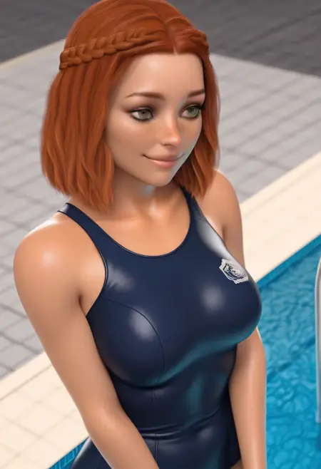 Selina, freckles, brown hair, braid, green eyes, red hair, medium breasts, lips,