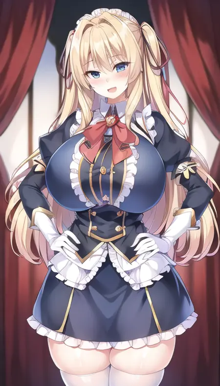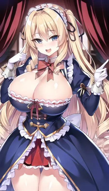 伊丽莎白,金发,帘式发型,中分,卷发,钻头发,巨乳,蓝眼睛,大小姐,校服,蓝色衬衫,开衫,长裙,手套,白色手套,荷叶边,荷叶边校服,发带,丝带,肘套,