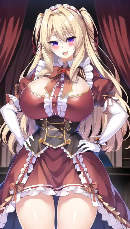 伊丽莎白,金发,帘式发型,中分,卷发,钻头发,巨乳,蓝眼睛,连衣裙,领口,丝带,红色连衣裙,带丝带的连衣裙,蕾丝连衣裙,荷叶边连衣裙,手套,白色手套,腰带,黄色腰带,长裙,荷叶边裙,大小姐,