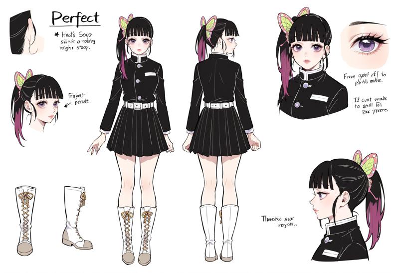 Simple Uniform: demon slayer uniform,skirt,belt,white footwear,boots,black skirt,pleated skirt,long sleeves,cross-laced footwear,gradient hair,lace-up boots,black jacket,jacket,lips,white belt,uniform,breasts,buckle,miniskirt