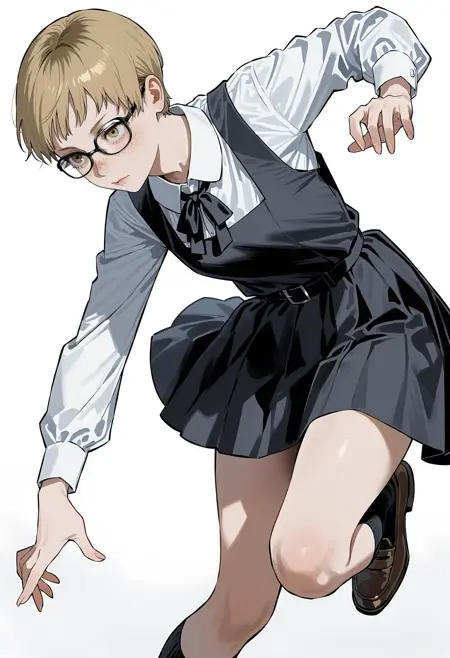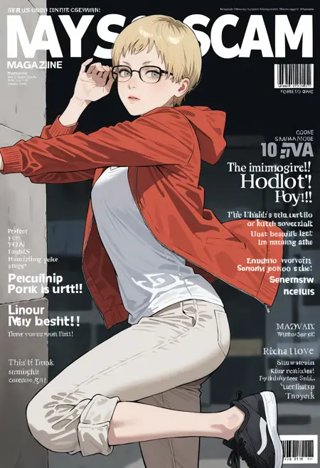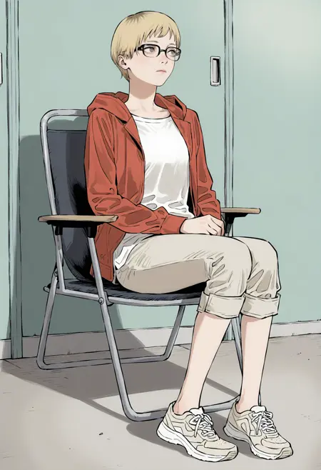 衣装2: 眼鏡、金髪、短い髪、ジャケット、ズボン、1人の少女、シャツ、白いシャツ、フード、オープンな服装、長袖、ズボンをまくった状態、カプリパンツ、赤いジャケット、靴、オープンなジャケット、パーカー