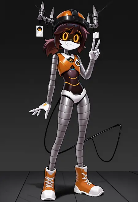 프롬프트: 주황색 눈, 색칠된 공막, 로봇, 뿔, 헬멧, 어두운 갈색 머리카락, 플랫테일.