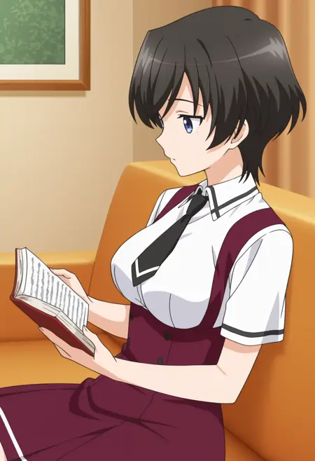 学校制服、紫のアンダーバストドレス、黒いネクタイ、