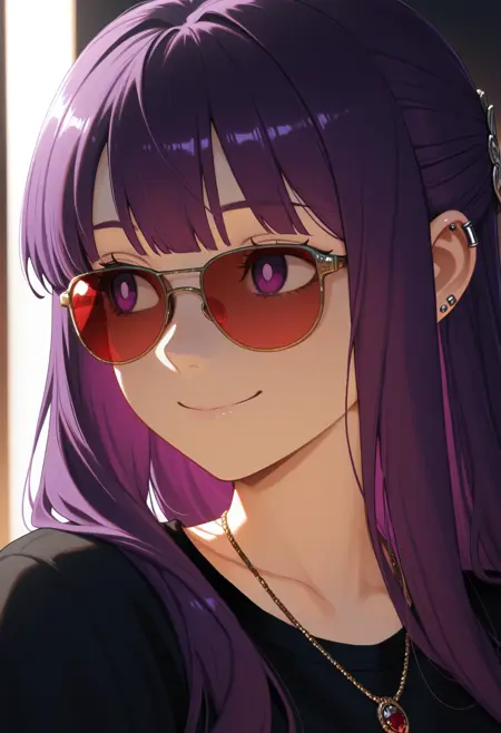 F3rn, 보라색 눈, 보라색 동공, 보라색 머리, 긴 머리, 반쯤 묶은 머리, 머리 장식