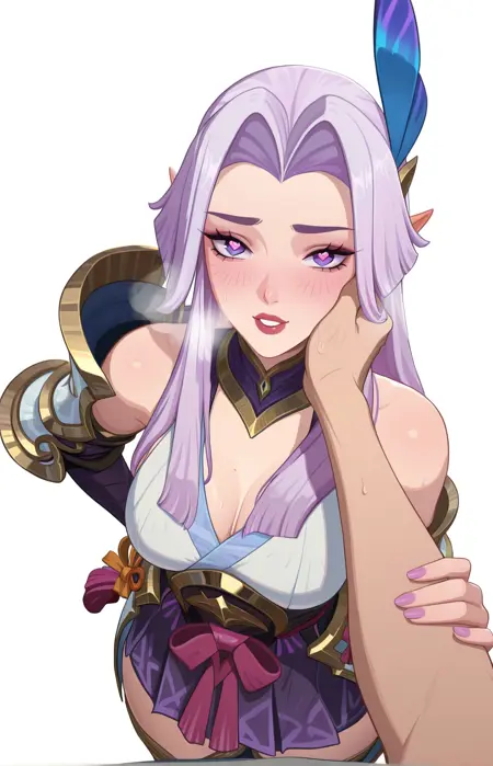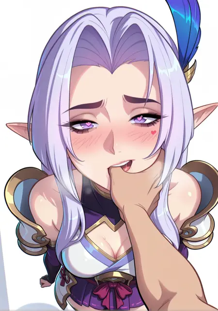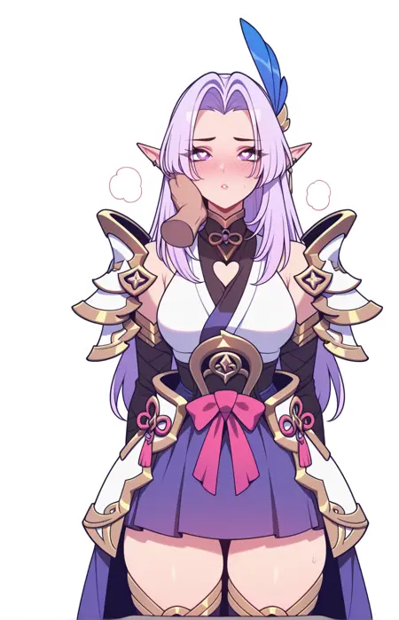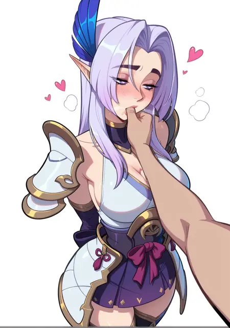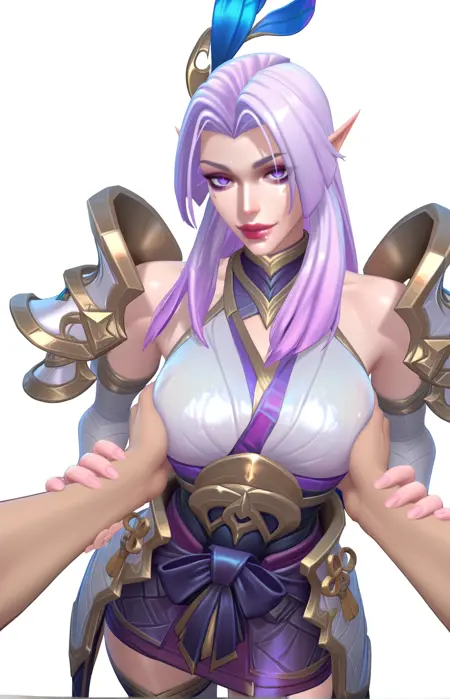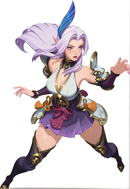 SB_KAyle, 뾰족한 귀, 긴 머리, 연보라색 머리, 곧은 머리, 보라색 눈, 갑옷 어깨 파드, 단일한 파란 깃털 머리핀, 소매 없는 상의, 보라색 치마, 허리 리본, 허벅지까지 오는 양말, 금색 갑옷 장식, 판타지 의상, 금색 테두리