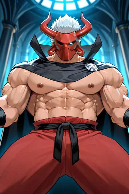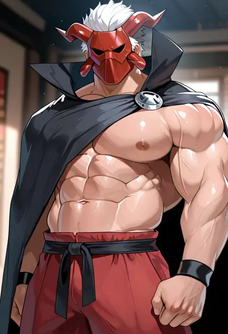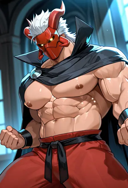 Prompt:gr0ant, Red pants, Black Cape, white hair, mask,